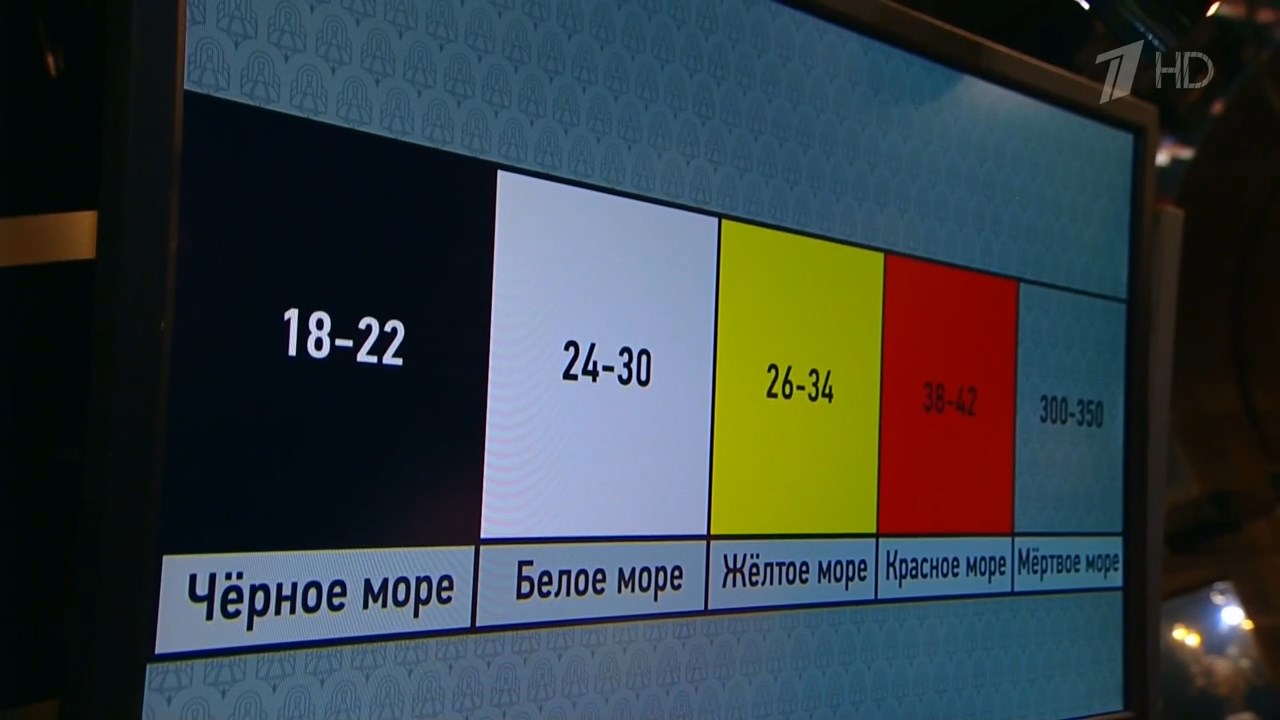 - Уважаемые знатоки, что с Вами? Географы собрались! Чёрное, белое, жёлтое и красное – цвет соответствует названию морей. Чёрное море, Белое, Жёлтое, Красное, Мёртвое. А Мёртвое море, конечно, не совсем море – это озеро. Да и в названии у Мёртвого моря не упоминается цвет, поэтому и прозрачное. Цвет не определишь. Числа обозначают солёность воды в промилле. Обидно Вам, наверное?