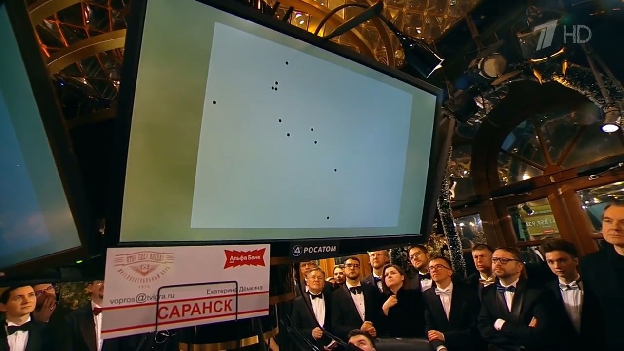 Правильный ответ: Точки соответствуют городам из которых приехали телезрители на сегодняшнюю игру. 11 точек – 11 городов. А точка, которой не было – посмотрите на конверт телезрительницы, у вас был ответ перед глазами всю минуту. Это Саранск!