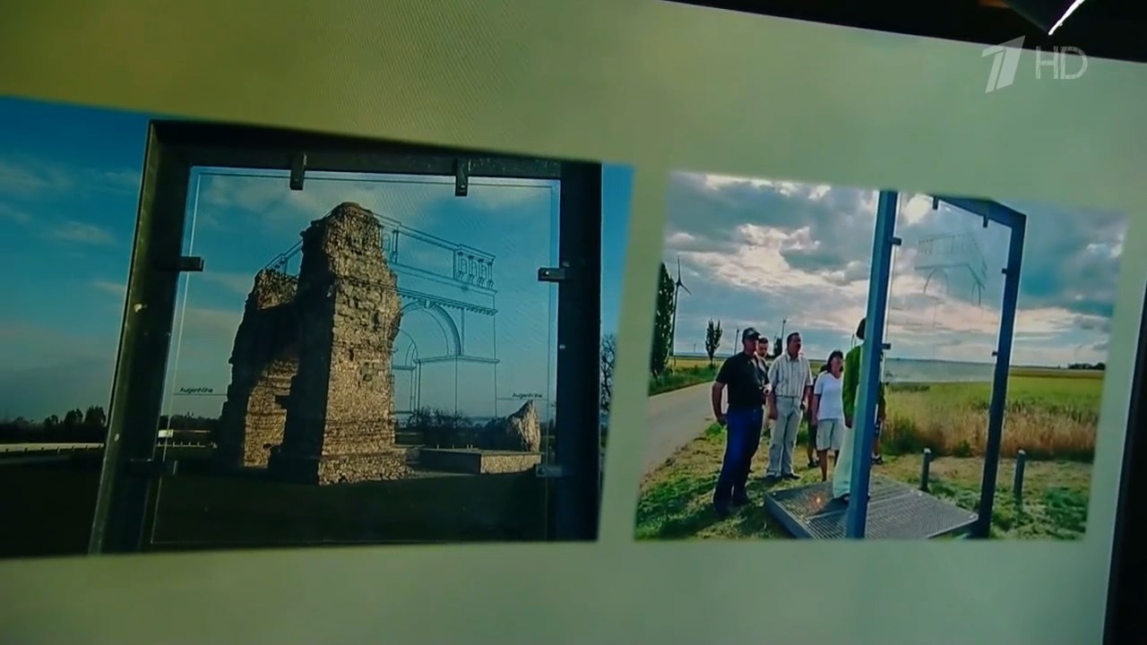 Правильный ответ: Этот музей под открытым небом расположен на месте древнего римского города. На стекле дорисованы стеклян… ээа, дорисовано как выглядела эта триумфальная арка. Дорисованы недостающие части строения.